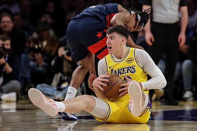 本场比赛中,湖人的先发锋线新星杰克-拉拉维亚(Jake LaRavia)的表现又一次跌落谷底。拉拉维亚全场出场32分30秒,投篮10中3,三分线外2中0,仅得到了6分8篮板2助攻2盖帽的数据,其中还包括了4个前场篮板,还有1次失误和3次犯规,正负值为-15。拉拉维亚在进攻端得到了不少投篮机会,然而他的进攻效率一塌糊涂,得分能力完全没有发挥出来,看起来也具备基本的投射能力。拉拉维亚在进攻端毫无手感。进攻端表现不佳,这一点也就算了,最关键的是,拉拉维亚在防守端的表现也是惨不忍睹的水平,同样没有办法起到更大的作用,表现同样是令人非常失望的。看起来拉拉维亚非常积极,然而实际上他在场上的效果并不理想,他在各方面的能力似乎都显得有些不足。