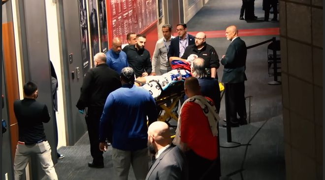 艾维痛苦倒在地上,根本无法起身,最终只能通过担架被抬离赛场。